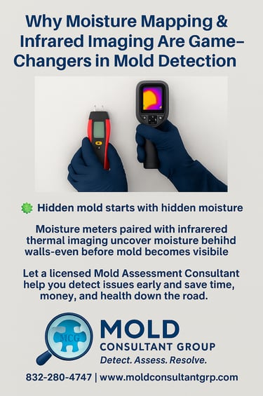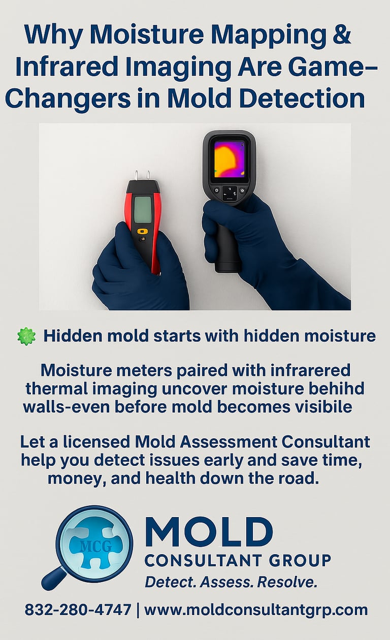 Moisture mapping and infrared imaging help identify these issues early, allowing for targeted mold testing, sampling, and remediation planning.